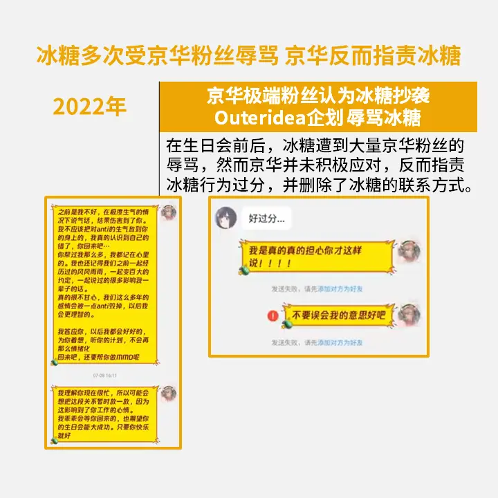 2022年7月上旬,张先生先炎上冰糖并拉黑她,然后7月中旬的生日会加回来,欲情故纵的把戏罢了,为了10w的醒目留言,冰糖花了钱依旧被网暴,冰糖粉丝开始发现猫腻,写文抨击。